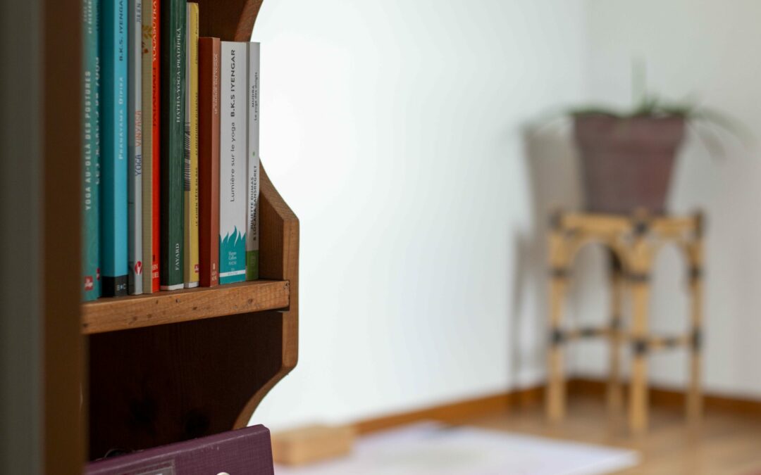 Gros plan sur la bibliothèque du studio, contenant des ouvrages de référence sur le yoga et le développement personnel. En arrière-plan, une plante apporte une touche naturelle au lieu.
